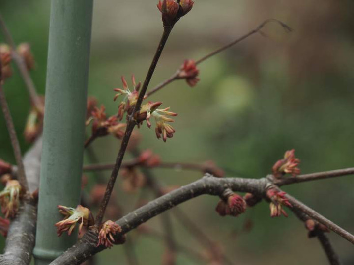 検索すると「雌雄同株、両性花で、3~4月に葉に先駆けて咲く。花弁が無く、暗紅色の葯をつける雄しべが10本以上垂れ下がる」とあります。
